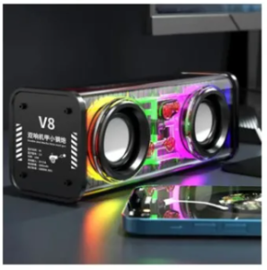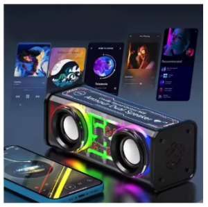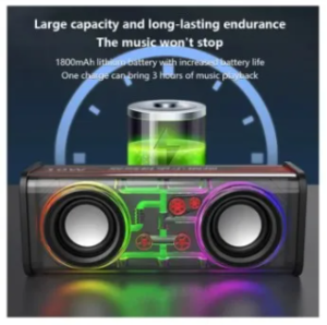 1. Bluetooth-compatible 5.0 Connectivity: Enjoy high-quality sound with fast, stable signal transmission up to 10m away.2. Dual Speakers: With 10W total power and 360° surround sound, this speaker delivers impressive audio performance with visible bass notes and clear music reproduction.3. Unique Transparent Mecha Design: The portable speakerâs unique design allows for a visually stunning experience with a multidimensional effect that enhances the overall sound quality.4. Long-lasting Battery Life: The wireless speaker features an 1800mAh lithium battery that provides up to 3 hours of continuous music playtime on a single charge.5. Colorful Phantom Streamer Light: With its cool and stylish exterior featuring dynamic lights that change with the sound, this loudspeaker will add an immersive dimension to your listening experience.